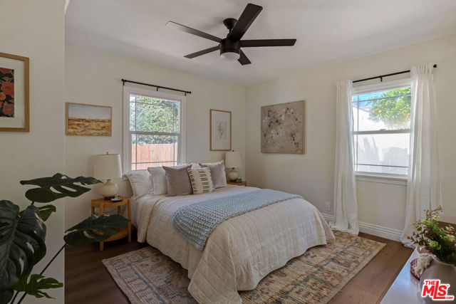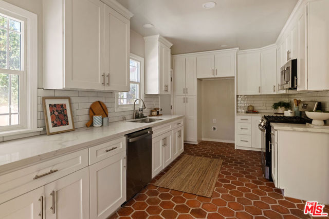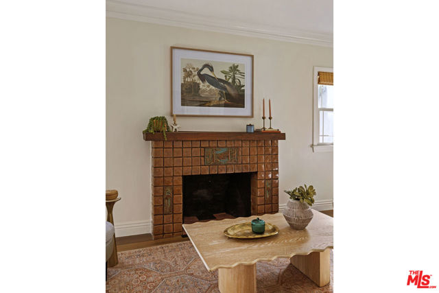 In the highly sought-after Normandie Heights neighborhood of Pasadena, this romantic 1925 Spanish enchants on a tree-lined street, with mountain peaks in the distance. A breezy front porch welcomes you to the south-facing home filled with natural light and warmth. Beautiful windows, wood floors, and a Batchelder-inspired fireplace grace the living room; an arched opening leads to the sunny dining. The spacious all-white kitchen is tastefully updated with terra-cotta tile floors, tons of storage, and room for a breakfast nook or office corner. Two sunny bedrooms include an ensuite primary; the guest bath is finished with stylish wallpaper. The generous backyard is perfect for summertime parties, with a hardscape patio for alfresco dining, and citrus trees and native landscaping throughout. Amenities include central AC, parking, and a laundry room with sink and storage. Enjoy local favorites Roma Market, Seed Bakery, Lavender & Honey, Union, and Agnes, and easy access to shopping and conveniences.