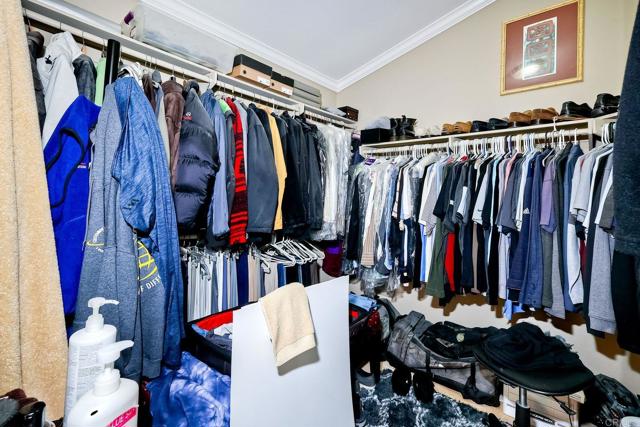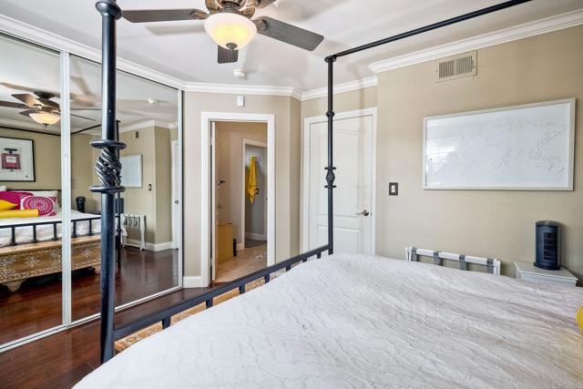 This home features a reimagined open-concept layout created by removing three walls between the kitchen, dining, and family room adding approximately 60 square feet and creating a bright, seamless great room ideal for everyday living and entertaining. The centerpiece kitchen offers a walk-around island with Bosch cooktop, breakfast bar seating, and rich walnut cabinetry with pull-out drawers, roll-outs, and lazy Susan. Chiseled-edge granite counters, stacked stone backsplash, and stainless steel Bosch and KitchenAid appliances complete the space. Scraped walnut engineered hardwood floors, crown molding, baseboards, skylights, and custom lighting enhance the light-filled interior. The family room includes built-in BOSE surround sound. The primary suite features a fireplace, dual vanities, soaking tub, separate shower, and walk-in closet. A Jack-and-Jill bath connects two bedrooms (one converted to a custom closet), plus a downstairs bedroom and full bath offer flexible living. Unique touches include a Travertine mosaic staircase, custom handrails, and numerous upgrades throughout—dual-pane windows, plantation shutters, A/C, whole-house fan and more. Outdoor spaces feature pebble paving in the front courtyard and backyard, tropical landscaping, and a gated entry. The garage offers wall-to-wall built-in storage cabinets. Located in Rancho Del Oro’s Villa Trinidad community with nearby park and tot lot, just minutes to shopping, dining, and Oceanside beaches.