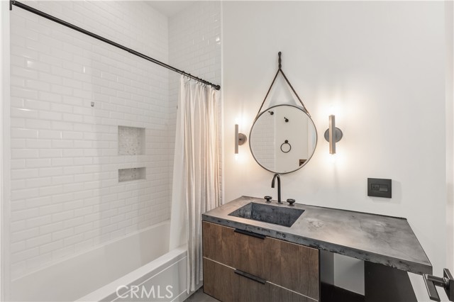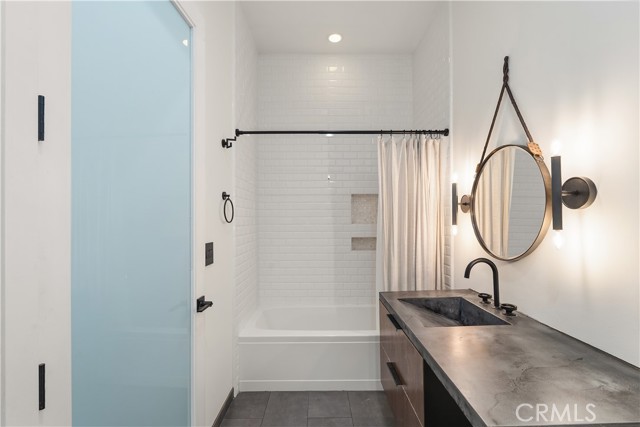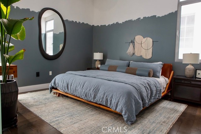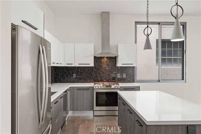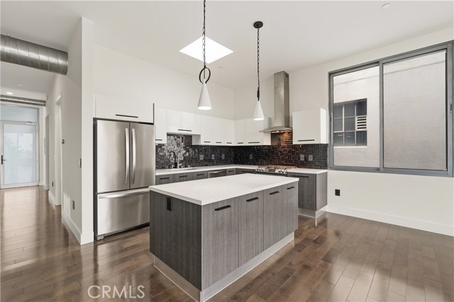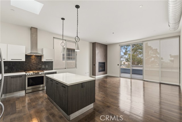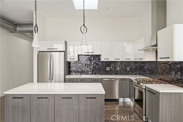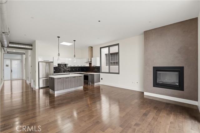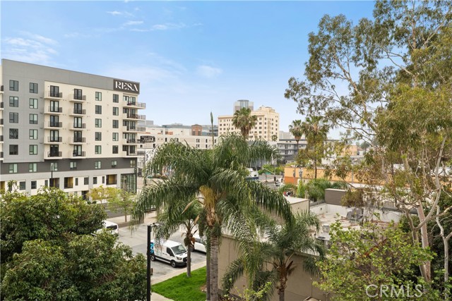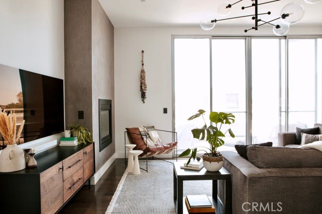 Welcome to the heart of downtown Long Beach—this penthouse condo has been thoughtfully elevated throughout. Enter through the skylit lounge into an open, airy layout with high ceilings, dark laminate wood floors, and floor-to-ceiling sliders that fill the living space with natural light. The open-concept kitchen blends warm and industrial design with black variegated tile, under-cabinet lighting, quartz countertops, and stainless steel appliances. The living room centers around a plastered fireplace with concrete feel, and opens to a spacious corner patio with vibrant city views that stretch all the way to the Palos Verdes Peninsula. Inside, you’ll find a spacious bedroom, with separate walk-in closet, in-unit laundry, and a full bathroom featuring a modern concrete vanity. Two dedicated parking spots in the subterranean, fully-secured parking garage add convenience. This home is walking distance to coffee shops, dining, shopping, entertainment, the Metro line, and a short drive to the beach and freeways. It's time to experience life at Newberry Lofts on Pine Ave!