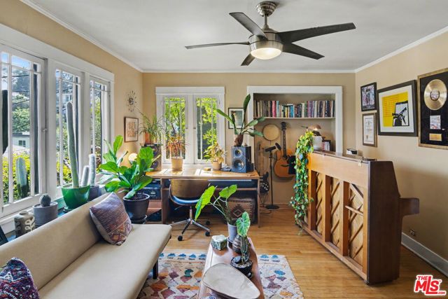 Set within a lush, garden-filled setting, this distinctive property blends classic California bungalow charm with flexible living and thoughtful design. The front residence is a beautifully maintained 1-bedroom, 1-bath bungalow surrounded by mature landscaping that creates a private, serene retreat. Warm wood floors, curated interiors, and an easy indoor-outdoor flow define the home, with multiple outdoor areas designed for both quiet living and relaxed entertaining. At the rear, a detached open floor-plan loft guest house offers a light-filled and versatile secondary living space. Vaulted ceilings with exposed beams and a lofted sleeping area create an open sense of volume, while the main level living area and kitchen provide functionality and flexibility. Ideal for guests, rental income, or a creative live/work environment. A detached office shed adds further flexibility, well-suited for work-from-home or studio use. The property backs to the historic Corralitas Red Car Trail, with nearby informal parking and direct gated access into the backyard. Layered outdoor spaces shaded by mature trees and thoughtfully composed to enhance the property's sense of privacy and connection to nature, creating a relaxed, compound-like feel. Ideally positioned near the best of the eastside, with convenient access to major freeways, Sunset Boulevard, the Silver Lake Reservoir, Echo Park Lake, and a curated mix of cafes, restaurants, and boutique shops. Los Feliz, Atwater Village, Glendale and Downtown LA are all within easy reach. A rare opportunity to own a character-rich property with versatile living options in one of Los Angeles' most sought-after neighborhoods.