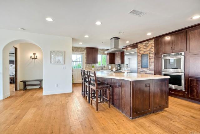 Experience the best of coastal living west of I-5 in one of Leucadia’s most coveted neighborhoods—where panoramic ocean views, timeless Spanish-inspired design, and exceptional versatility come together on an expansive, private estate. The main residence is thoughtfully designed with two fully self-contained levels, each featuring its own kitchen, living space, and laundry, allowing for complete separation or seamless integration as one expansive home. Additionally, a fully detached 2-bedroom, 1-bath ADU (casita) provides a private residence with its own yard, parking, and entrance. The upper level of the main home is the showpiece, where sweeping ocean views take center stage. The open-concept great room features a chef’s kitchen with a stunning Perla Venata quartzite island, hand-painted Tabarka tile, custom wood beams, solid alder doors, and engineered wire-brushed oak flooring throughout. Panoramic doors open to an expansive ocean-view deck with a gas fireplace creating the ultimate setting for sunset gatherings and relaxed coastal evenings. This level also includes a luxurious primary suite with a private ocean-view balcony, an additional bedroom, a beautifully appointed guest bath with a clawfoot tub and artisan tile, and a dedicated laundry/craft room. The lower level offers three bedrooms and two bathrooms (including an en-suite), a spacious living room with a wood-burning fireplace, and its own full kitchen and laundry providing a completely independent living space ideal for extended family or guests. The detached ADU (casita) is a true standout, offering a full kitchen, living room, separate laundry, private yard, dedicated parking, and storage completely independent from the main home. It's perfectly suited for rental income or long-term guests. Outdoor living is equally exceptional. The front courtyard welcomes you with a tranquil fountain, leading to a sleek saltwater pool and spa, outdoor bar, and gas fireplace creating a resort-style ambiance. The backyard is a lush retreat with mature fruit and citrus trees, raised garden beds, and a detached workshop or office. Additional highlights include gated entry and RV parking. All of this is just minutes from the beach, surf breaks, local coffee shops, and the vibrant yet laid-back lifestyle that defines Leucadia.