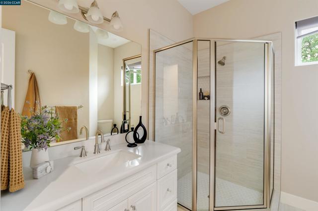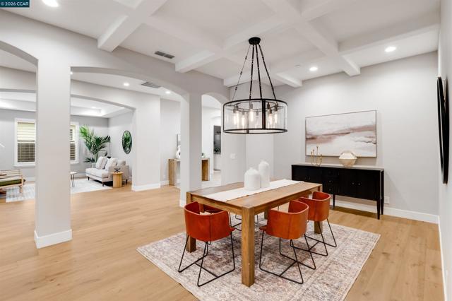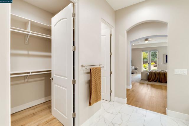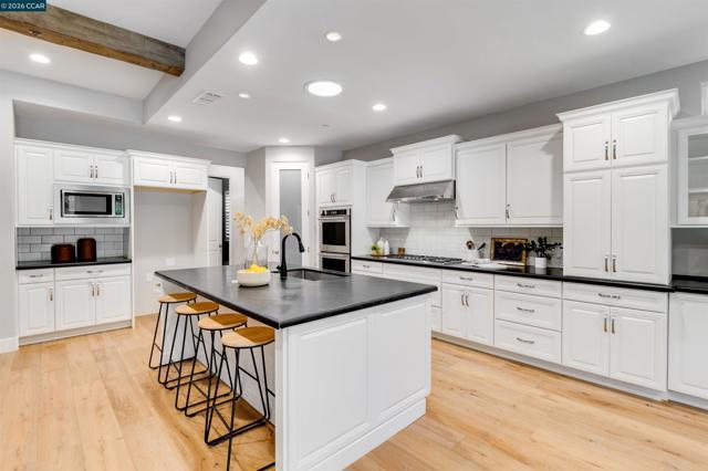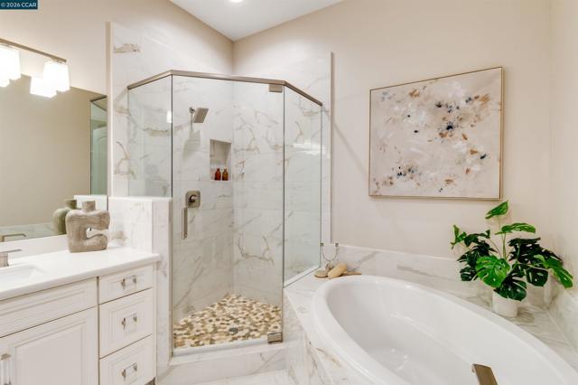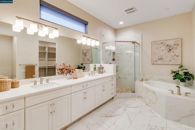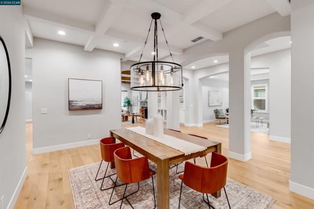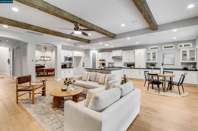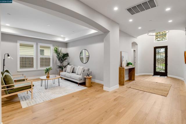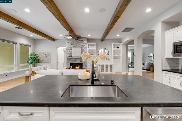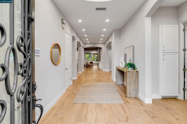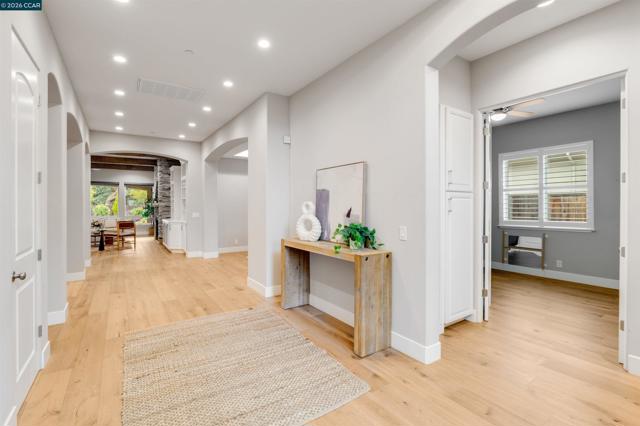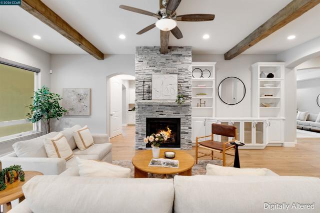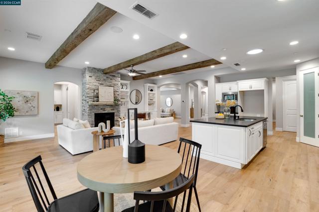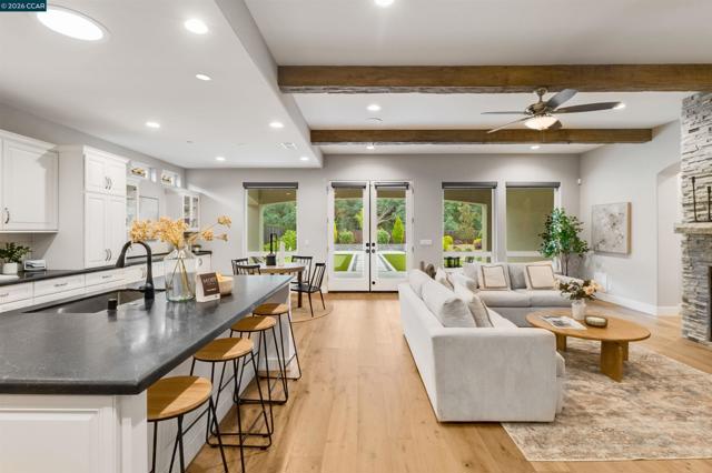 Welcome to 8705 Morgan Creek Lane, a refined residence in the prestigious Morgan Creek Golf Course community. A grand entry with soaring ceilings and a statement chandelier establishes an immediate sense of scale and sophistication. Inside, wide-plank French oak flooring leads into an expansive great room where custom faux wood beams, an imperfect smooth wall finish, and a dramatic floor-to-ceiling stone fireplace create warmth, texture, and architectural presence. The kitchen is beautifully appointed and highly functional, featuring extended custom cabinetry, a premium Thermador range, oversized island, and seamless flow into the main living space - designed for everyday living and elevated entertaining. High-end shutters and designer finishes carry throughout, while both the primary and guest bathrooms offer heated tile floors, adding a meaningful layer of comfort. The backyard is a true extension of the home, thoughtfully designed with a custom masonry wall, putting green, expanded hardscape, integrated landscape lighting, and outdoor surround sound - creating an ideal setting for daytime enjoyment and evening ambiance. Extensively upgraded and turnkey, this home offers a rare blend of design, comfort, and effortless living in one of Roseville’s most desirable communities.