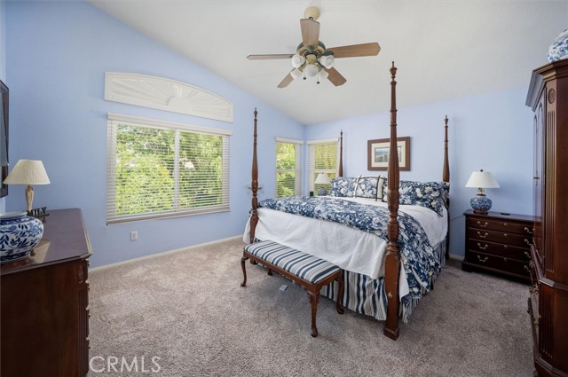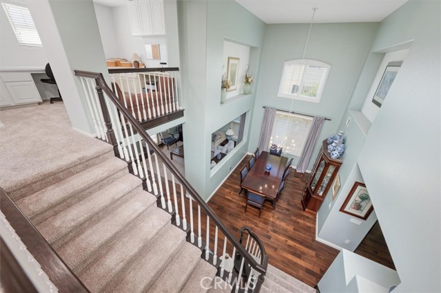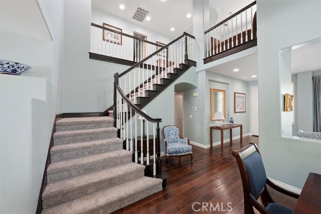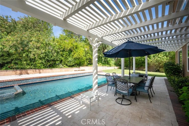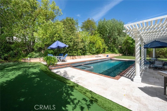 End of culdesac location with a private backyard featuring a pool, spa, putting green, grassy area, covered patio, large side yard, an oversized family room off the kitchen, and no mello roos. Original owners have meticulously maintained and thoughtfully upgraded this home throughout. The backyard was fully renovated with PebbleTec pool finish, Pentair equipment, and LED color changing lighting. The updated kitchen has white cabinetry, granite countertops, and a large center island and opens directly to the expanded family room with fireplace. Flooring includes wood and plush carpet. Additional upgrades include dual pane Milgard vinyl windows, HVAC system replaced approximately 2 years ago, and updated attic insulation. The flexible floorplan includes a downstairs bedroom and full bathroom, along with an indoor laundry room with sink. Upstairs features three additional bedrooms plus a loft. The primary suite offers high ceilings, a walk in closet, soaking tub, walk in shower, and dual vanities. Located in the Pacific Hills neighborhood and zoned for Valencia High School, Rio Norte Junior High, and Mountain View Elementary. No LMD on taxes as HOA cares for the common areas.