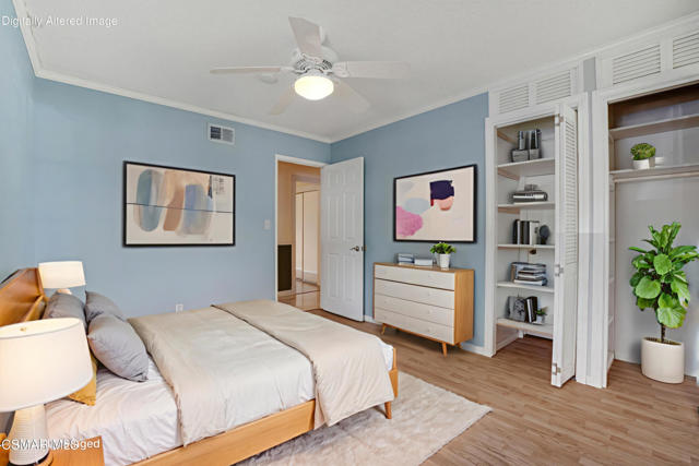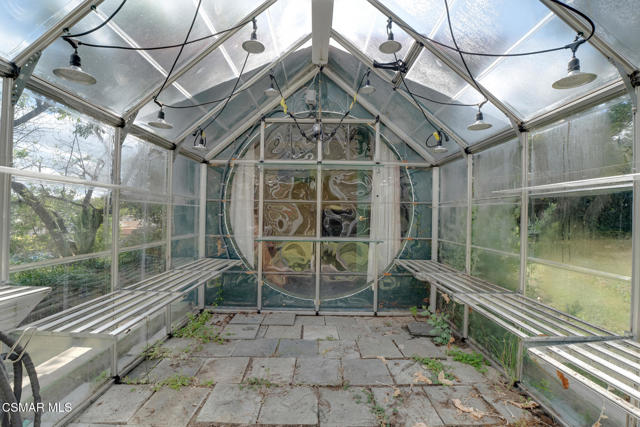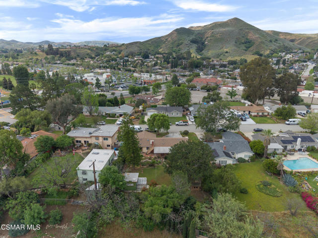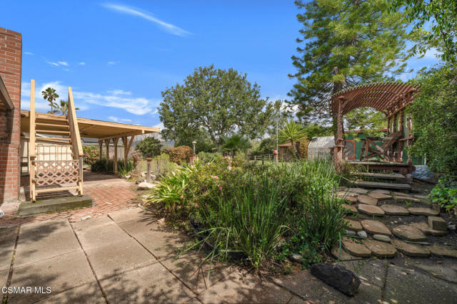 This single-story home in West Simi Valley is set along a cul-de-sac street and offers a front yard view of Mt. McCoy, surrounded by established homes on larger lots. Offering 3 bedrooms, 2 bathrooms, and approximately 1,268 sq. ft. of living space on an 11,325 sq. ft. lot, the property provides a comfortable and functional layout. Curb appeal begins with a large shade tree, mature landscaping, and an extra-wide driveway leading to the 2-car garage with roll-up door and windows. Wood accents and an etched glass front door add character to the exterior. Inside, wood-like laminate flooring runs through most of the home, complemented by detailed wood millwork including wainscoting, crown molding, baseboards, and wood window casings. Centered around a rock-front gas fireplace with a custom wood mantle, the living room also features a skylight and ceiling fan for added light and comfort. A pass-through connects the dining area to the living room, creating a functional layout. In the kitchen, Formica countertops, wood cabinetry, a breakfast bar, 4-burner gas cooktop, oven, dishwasher, and refrigerator provide everyday functionality. A garden window overlooks the front yard, and direct access to the garage adds convenience. Two secondary bedrooms include ceiling fans, mirrored closet doors, and a shared closet configuration between them, allowing flexibility for bedroom, office, or extended use. Nearby, the hall bathroom offers a single-sink vanity, crown molding, a tub/shower combination, and additional storage. Set toward the rear of the home, the primary bedroom features a sliding glass door to the backyard, mirrored closet, an additional closet, and an attached bathroom with a walk-in shower and glass doors, pedestal sink, and storage cabinetry. Additional functionality is found in the 2-car garage, which includes storage cabinets, washer and dryer, and a partially framed section that was previously used as a small bedroom or bonus space, along with direct access to the backyard. Outdoors, the backyard is spacious and full of character. A brick patio with a solid wood cover and ceiling fan creates a comfortable outdoor area, complemented by multiple sitting spaces, a wood gazebo, and a mature oak tree providing natural shade. A succulent garden, winding rock pathways, greenhouse, and a shed with a barn-style door, along with an additional storage shed and rain barrel, add both charm and utility. The size of the lot offers room to expand, garden, or reimagine the space. Improvements include a composition shingle roof installed at the end of 2015, newer central air conditioning unit, and dual-pane windows. A well-maintained home in a desirable West Simi Valley location, ready for its next chapter.