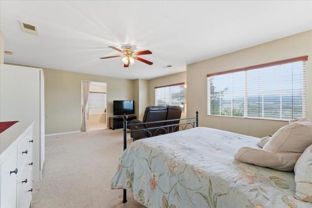 Welcome to this gorgeous 4 bedroom, 3 bathroom, 2,580 sq ft hillside gem tucked inside San Marcos’ Vallecitos Ridge gated community! From the moment you arrive, the Mediterranean style exterior, wide driveway, and two car garage make a lasting first impression. Come inside and feel right at home! The main level flows beautifully from a formal dining room with hardwood flooring to a bright living room anchored by a cozy fireplace, and into a well appointed kitchen featuring granite countertops, ample cabinetry, gas cooktop, double wall oven, and a center island with bar top seating. A sunny eat in nook with sliding glass doors brings the outdoors in with direct access to the backyard and those jaw dropping mountain views! A main level bedroom and full bathroom add ideal flexibility for guests or multigenerational living. Upstairs offers even more to love with a spacious bonus loft, an oversized primary suite complete with a walk-in closet and a private en suite with dual vanities, soaking tub, and separate shower. Two additional bedrooms, a shared full bathroom, and a conveniently placed upstairs laundry room round out the upper level perfectly. Out back, a covered patio with ceiling fans sets the stage for year round entertaining, opening to a generous concrete space with sweeping mountain and valley views. Other highlights include: upgraded HVAC system, dual pane windows, newer exterior paint, custom backyard patio cover, and drought-tolerant landscape design at front yard and backyard. The gated community and neighborhood tot lot makes this the perfect place for your family to enjoy and put down roots! LOCATION! LOCATION! LOCATION! Conveniently located near San Marcos District’s top rated schools, parks, grocery, restaurants, shopping, easy access to freeways, and more. This one checks every box!