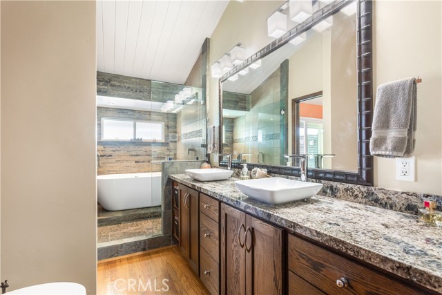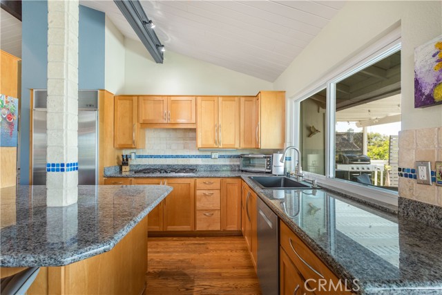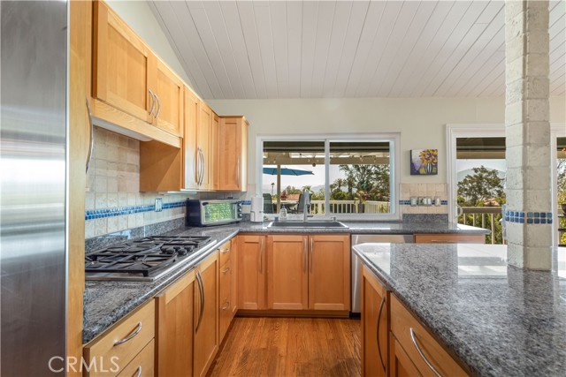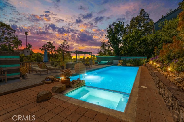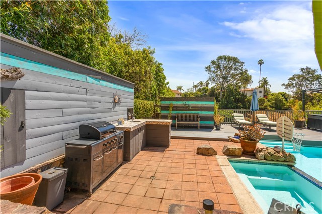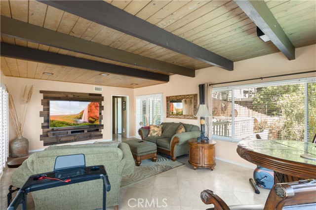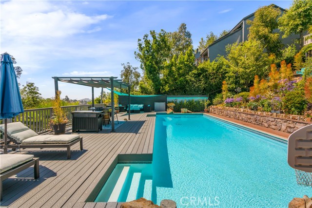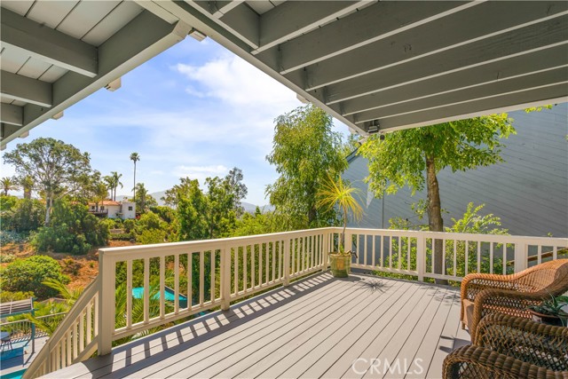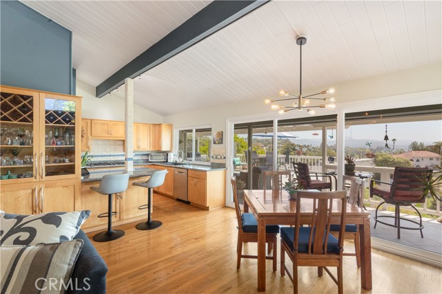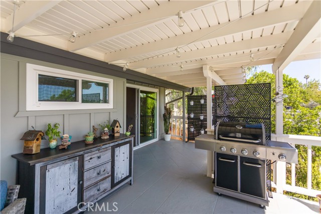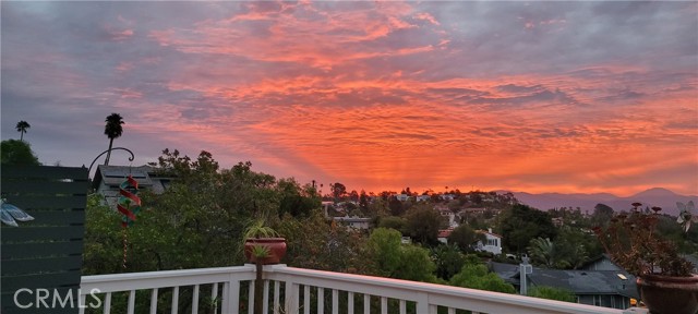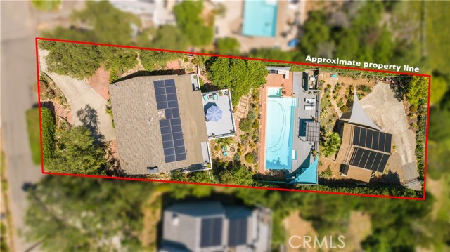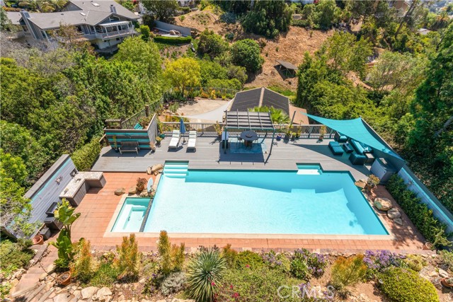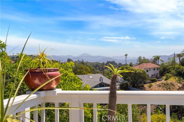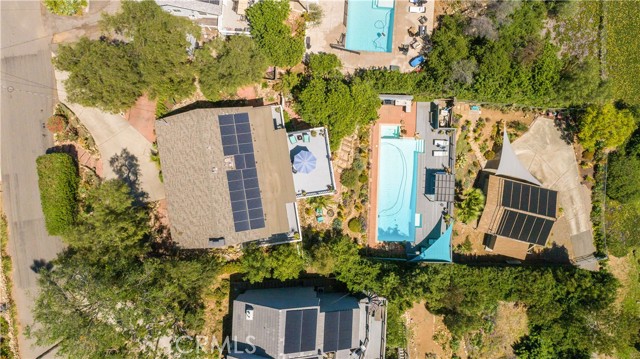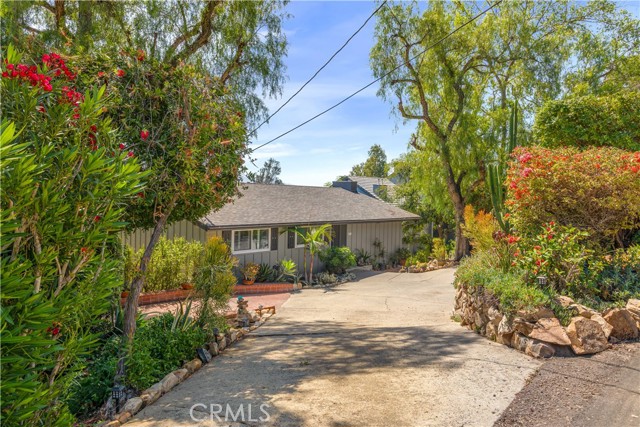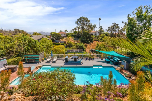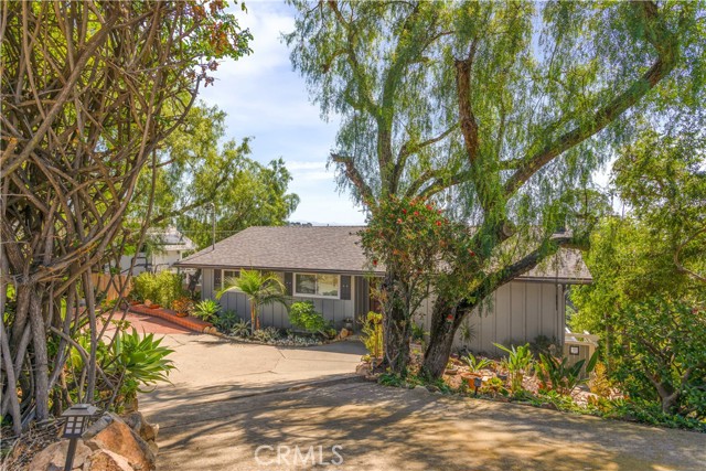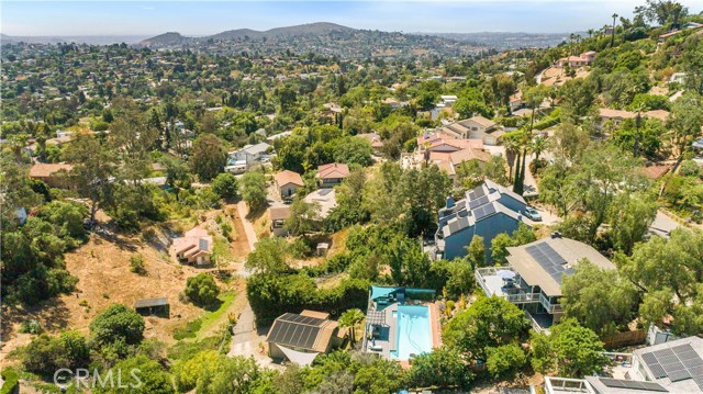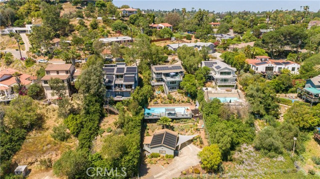 Embrace the feel of a Laguna Beach–inspired treehouse retreat in this exceptional Mount Helix hillside home, where breathtaking views, terraced grounds, and seamless indoor-outdoor living create a truly special setting. Includes pool, solar and studio residence for extended family or rental income with private entrance. Beautifully designed multi-tiered landscaping with winding pathways and built-in seating welcomes you, while multiple patios—each with views—offer the perfect spaces to relax or entertain. Enjoy sweeping 180-degree panoramic southern views with both sunrises and sunsets gracing the horizon. Flooded with natural light, the 2,100 sq ft main residence features an open-concept layout with the kitchen and living areas flowing effortlessly to a wrap-around deck, creating ideal indoor/outdoor living. Nearly every room captures stunning views and offers direct outdoor access. The main level showcases a mid-century modern feel with clean lines, quality wood flooring, an upgraded kitchen, primary bedroom and a remodeled primary bath. The lower level includes two bedrooms and a spacious secondary living area, all opening to patio spaces and serene views. There is also a finished artists retreat/bedroom with separate entrance that has easy access to plumbing and sewer for the potential to create another rentable area. The backyard is an entertainer’s dream with steps down to an oversized solar-heated pool (25’ x 45’), lounging deck, and outdoor kitchen complete with sink, BBQ, and refrigerator. The terraced 1/3-acre lot provides space to garden, unwind, or simply take in the scenery. A haven for nature lovers, the property attracts hummingbirds, blue jays, and seasonal orioles. Additional features include an income-producing studio with kitchen, bath, and 1-car garage, plus an artist’s space or optional bedroom. Owned solar, newer roof (2022), dual-pane windows, plantation shutters, water filtration system, and a unique subterranean space ideal for a wine cellar complete the home. Ideally located on the foothills of Mount Helix with convenient access to shopping, this property offers privacy, versatility, and a truly resort-like lifestyle.