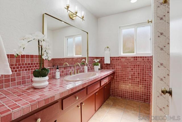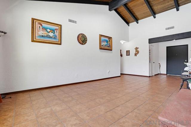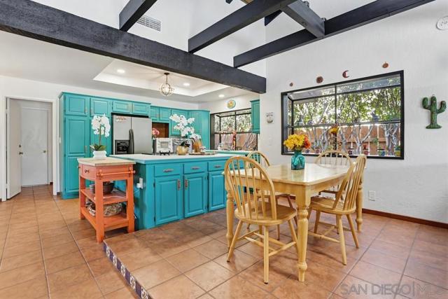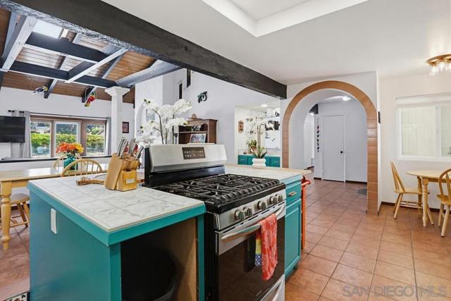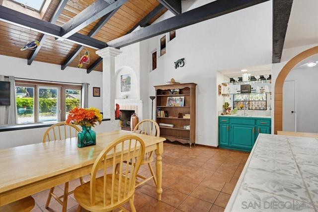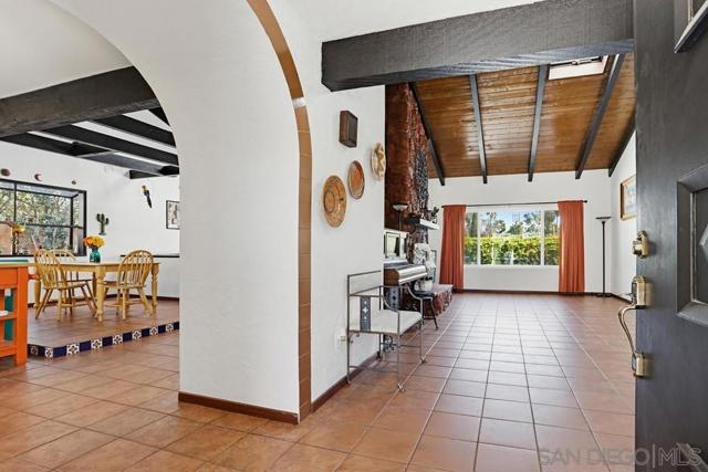 This beautifully designed single-story home in Bonita reflects timeless Mediterranean-inspired architecture with warm character & effortless indoor-outdoor living. Showcasing terracotta tile roofing, arched entryways, & cohesive design details throughout, the home offers a distinctive & inviting aesthetic. Inside, terracotta-style flooring flows seamlessly throughout, adding warmth & charm to every space. The living room impresses with vaulted wood plank ceilings, exposed beams, skylights, & abundant natural light, all centered around a striking double-sided floor-to-ceiling fireplace that connects the living and family rooms—creating a welcoming and elegant focal point.The kitchen is full of personality, featuring vibrant cabinetry, tile countertops, and a functional island, while opening seamlessly to both the main living area and dining room—perfect for entertaining & everyday living.The primary suite offers a private retreat with a dedicated dressing area, walk-in closet, & an en-suite bath showcasing custom tilework & a walk-in shower. Secondary bedrooms are well-sized, offering natural light and versatility. Recent 2024 upgrades include new HVAC, A/C, heating, ducting, a new main electrical panel, updated plumbing in all bathrooms, dual pain windows—ensuring modern comfort and peace of mind. Step outside to a serene backyard retreat featuring an in-ground pool, spacious patio, and mature landscaping with a variety of fruit trees.