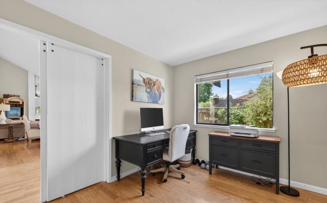 Incredible single-level home in Morgan Hills highly sought-after Carriage Square community. Light & bright throughout, this beautifully maintained residence offers 3 bedrooms & 2 bathrooms, W/a flexible third bedroom ideal for a home office. The inviting primary suite features a walk-in closet, sliding glass door to the backyard, & an updated bath with new lighting & a refinished shower over tub. Hardwood floors flow through the main living areas, complemented by a remodeled kitchen & comfortable carpeted bedrooms. Enjoy seamless indoor-outdoor living in the stunning backyard, complete with paver patio, fountain, & ambient lighting, perfect for relaxing or entertaining. Additional highlights include central heating & air conditioning, indoor laundry, & a 2-car garage equipped with an electric car charger. Residents of Carriage Square enjoy access to a community pool, green space, & play area. Ideally located near downtown Morgan Hill, W/easy access to dining, shopping, & entertainment. See this first you will love it!