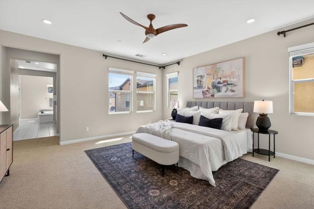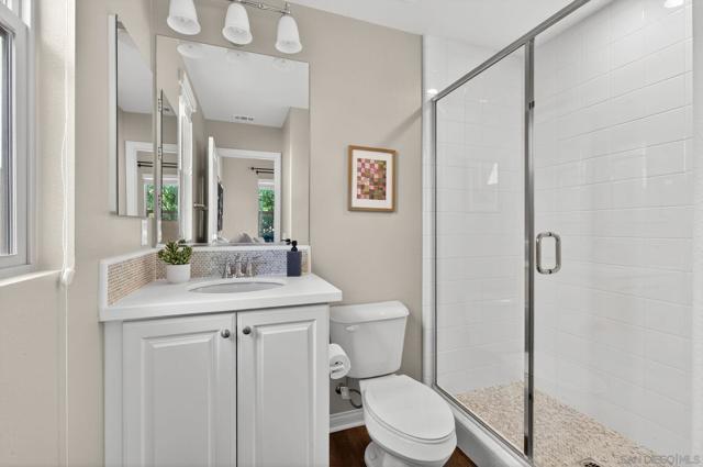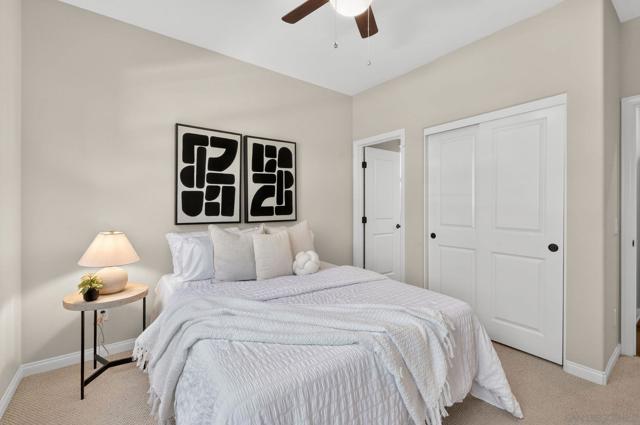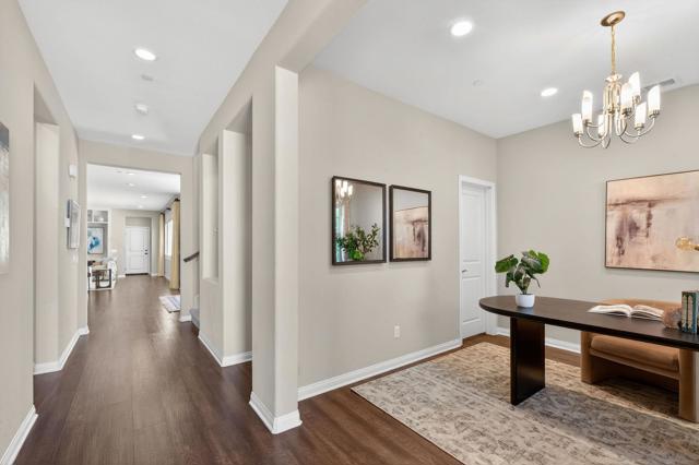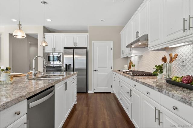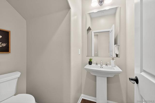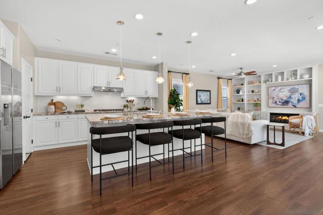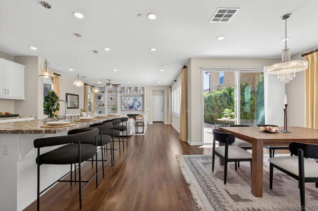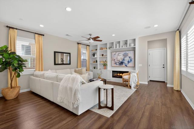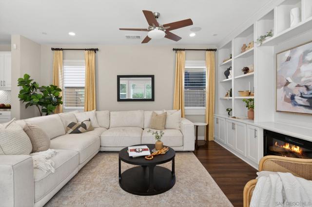 Welcome to sought-after Harmony Grove Village, where comfort, convenience, and community come together. This home offers a thoughtfully designed layout ideal for everyday living. The kitchen features a large center island with bar seating, stainless steel appliances, and ample storage, flowing seamlessly into the open-concept living and dining areas—perfect for both relaxing and entertaining. Custom built-ins enhance the dining room, living room, and primary bedroom closet, adding both style and functionality. The main level also includes luxury vinyl flooring and a convenient powder room for guests. Step outside to a private, easy-care patio space, ideal for outdoor dining. Upstairs, the spacious primary suite includes a walk-in closet and dual sink vanity. Two additional bedrooms share a Jack-and-Jill bathroom with dual vanities, offering both functionality and privacy. A dedicated laundry room with storage and an attached two-car garage provide added everyday convenience. Additional highlights include a water softening system and a sprinkler system, adding to the home’s efficiency and ease of maintenance. Residents of Harmony Grove Village enjoy access to community pools, spa, parks, playgrounds, BBQ areas, and miles of scenic walking and biking trails. A great opportunity to own in one of North County’s most popular planned communities!