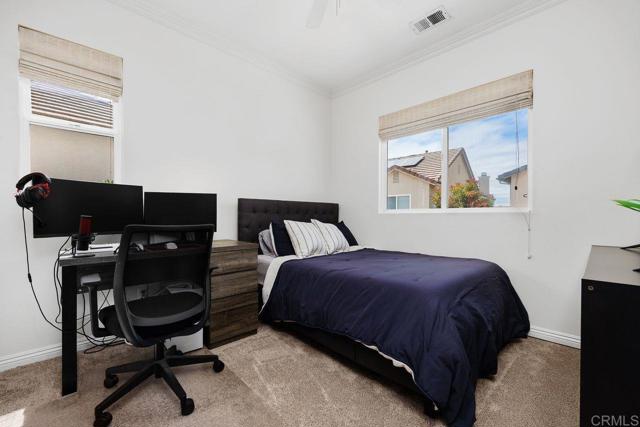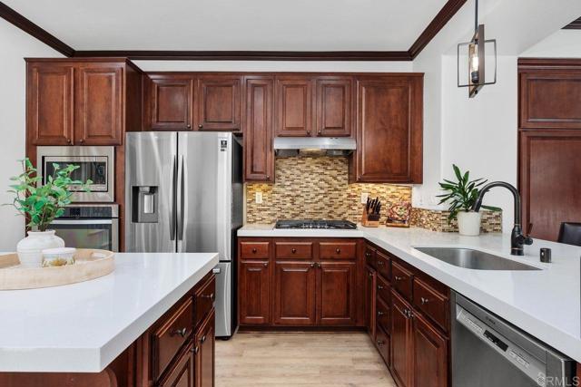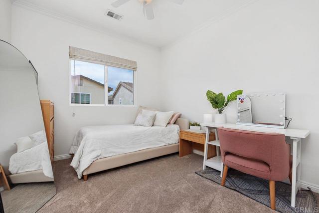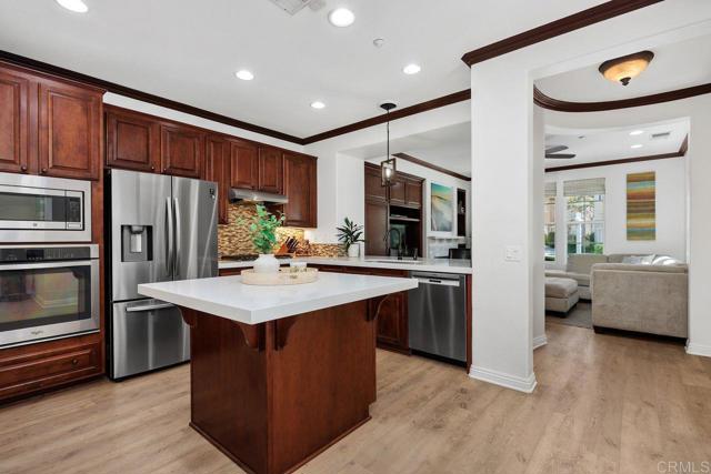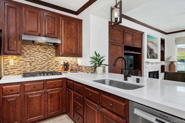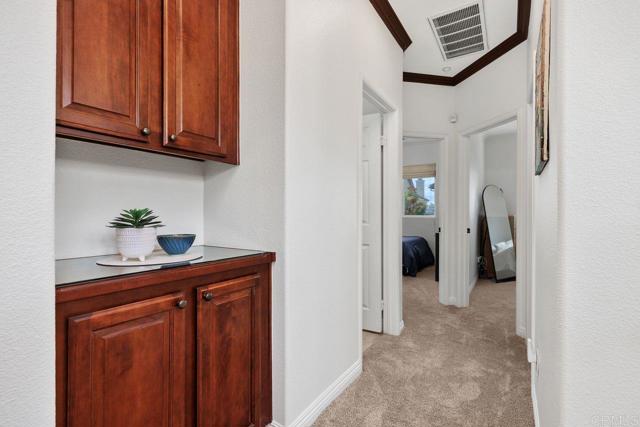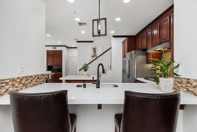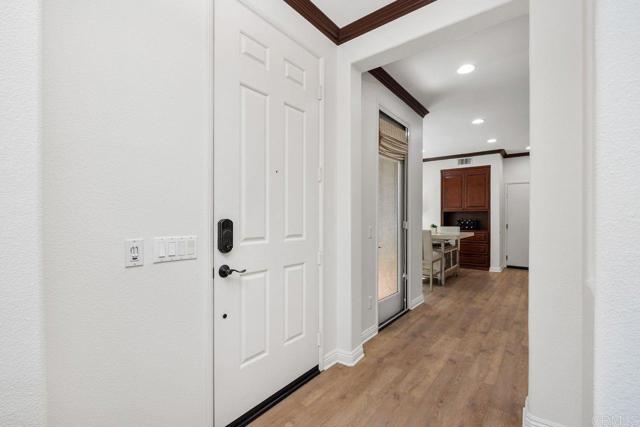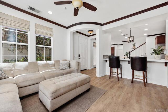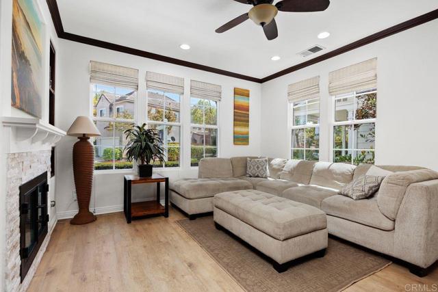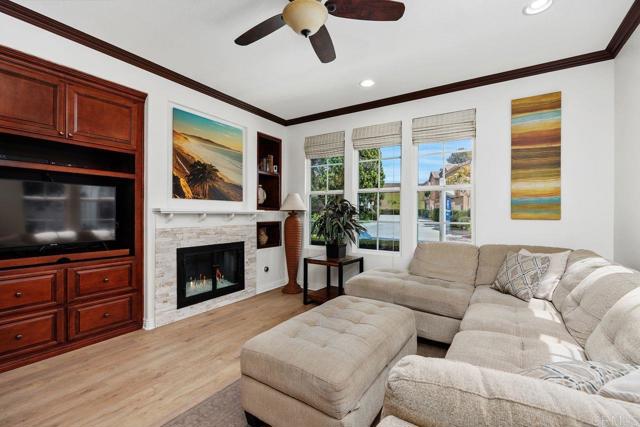 Welcome to this beautifully maintained residence in the sought-after Summerwood community of 4S Ranch, where thoughtful upgrades and timeless design create a home that feels both refined and inviting. Fresh interior paint and new carpet pair effortlessly with neutral laminate flooring and elegant crown molding throughout the main level, setting a warm and sophisticated tone from the moment you enter. The living room features custom built-ins and a stunning fireplace with a new stone surround and inserts, offering a perfect space to relax or entertain. The open-concept kitchen is designed for both everyday living and hosting, with new countertops, a center island, and a peninsula ideal for casual dining. An adjacent dining area provides space for more formal gatherings. Just outside, a private courtyard invites you to enjoy al fresco meals and evening gatherings, surrounded by a low-maintenance patio and ambient lighting that create a peaceful outdoor retreat. Upstairs, the spacious primary suite offers a true escape, complete with generous storage and a walk-in closet with custom organizers. Step onto the private balcony to enjoy your morning coffee or unwind at the end of the day. The primary bath is well-appointed with upgraded countertops, dual sinks, a separate shower, and a soaking tub. Two additional generously sized bedrooms feature built-in closets and share an upgraded secondary bath. The conveniently located upstairs laundry room includes a sink for added functionality. Additional highlights include dual EV charging stations, recessed lighting, a new water heater (2026), and garage storage racks. Located within the highly regarded Poway Unified School District, this home sits directly across from 4S Ranch Heritage Park and is just a short walk to Del Norte High School. This is a rare opportunity to enjoy comfort, style, and an exceptional location all in one.