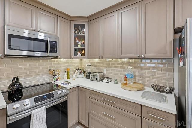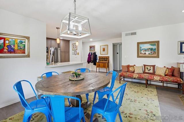 Bright and move-in ready 2 bedroom 2 bathroom condo with convenient access to I-15 and I-8. The interior has been fully refreshed with new flooring throughout, fresh paint, and a renovated kitchen featuring stainless steel appliances and an upgraded bar area that opens to the spacious living and dining layout. The primary bedroom offers ample space with mirrored closet doors and a walk-in closet, providing flexibility for a home office or additional storage. The unit includes in-unit laundry hookups, a private patio with storage, and a newer furnace for added comfort. The building offers elevator access with close proximity to the covered carport with overhead storage. Community amenities include a pool, spa, exercise room, and tennis courts.
