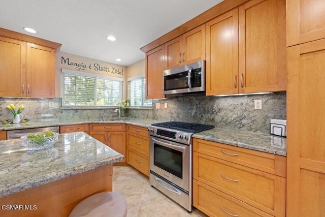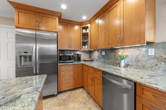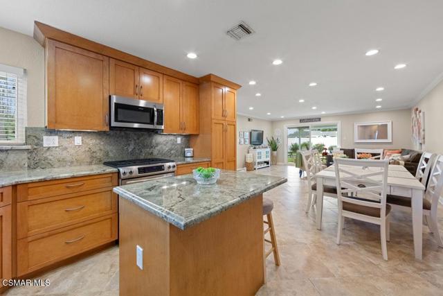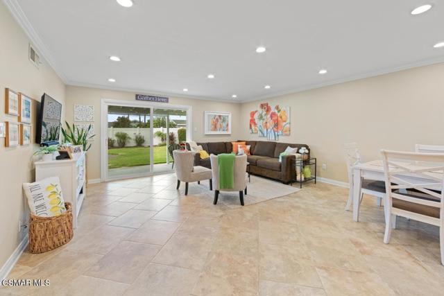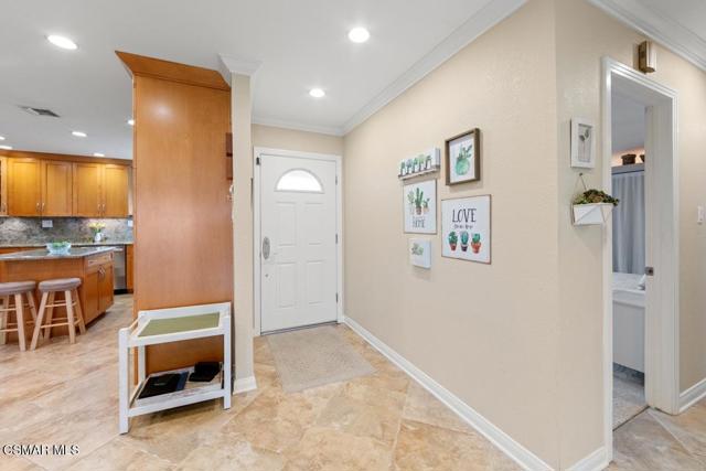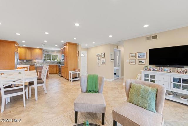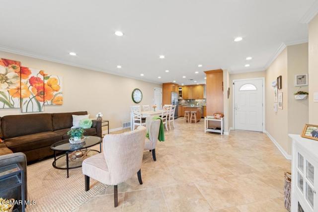 Stunning curb appeal welcomes you to this beautifully remodeled East Simi single-story home. This light and bright 3-bedroom, 2-bath property offers 1,218 sq ft of open-concept living and extensive upgrades throughout. The luxurious island kitchen features newer cabinetry, gorgeous granite countertops, stainless-steel appliances, and rich travertine like flooring that continues into the living room--an ideal space for relaxing or entertaining. Smooth ceilings, crown molding, recessed lighting, fresh paint, and new bedroom carpet create a clean, move-in-ready feel. Dual-pane windows provide quiet, year-round comfort, whether in summer heat or winter chill. The primary suite includes a private bath with a designer vanity and granite like countertop, while the two additional bedrooms share a remodeled full bath. All bedrooms include ceiling fans. The spacious backyard offers lovely mountain views, a welcoming patio, a cozy fire pit, fruit trees, flowering gardens, and a well-kept lawn. A quality storage shed adds convenience. The two-car direct-access garage includes a full laundry area and a partially finished bonus space--perfect for an office, home gym, or hobby room. Located close to parks, recreation, shopping, dining, and commuter routes, this home combines comfort, convenience, and style.