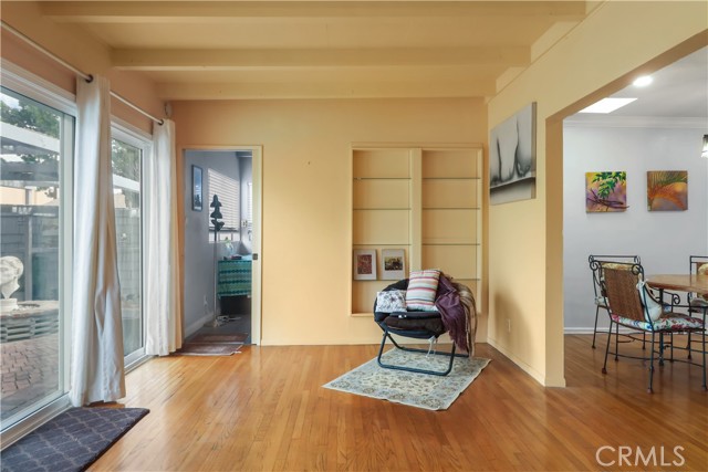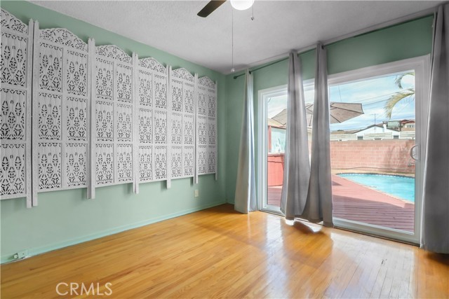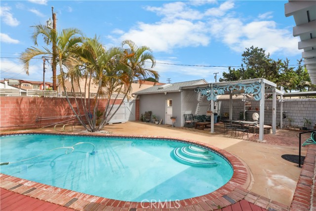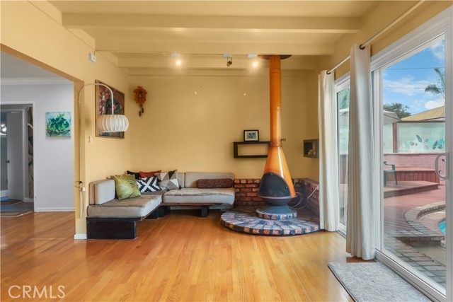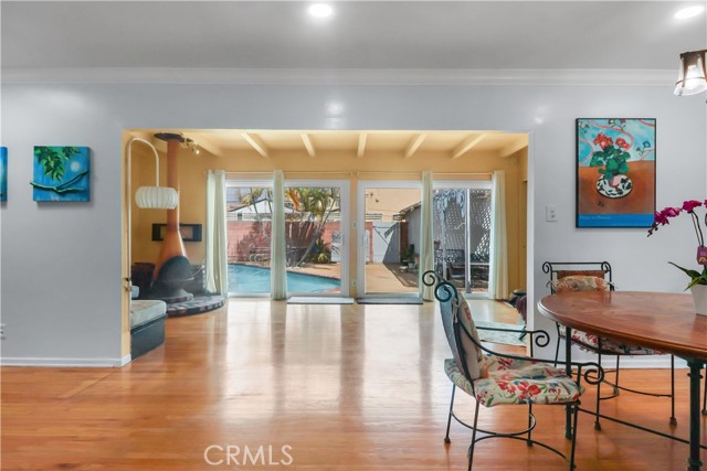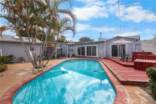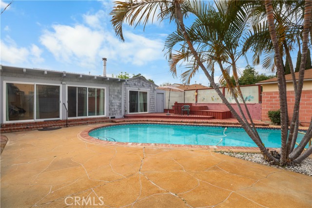 Beautiful 3 bedroom plus den, 2 bath pool home located in the sought-after Treeline neighborhood. Conveniently situated within walking distance to Nicolas Junior High School, this home offers comfort, style, and great potential. Enjoy a good-sized backyard with a sparkling pool, perfect for relaxing or entertaining. The two-car detached garage has excellent ADU potential with convenient alley access in the back. The remodeled kitchen features quartz countertops, stainless steel appliances, a breakfast area, and laundry hookups nearby for added convenience. The living room and family room showcase hardwood flooring, and the family room includes a cozy fireplace. Additional highlights include recessed lighting, remodeled bathrooms, newer windows, a welcoming front porch, and central heat and A/C. Ideally located close to markets, shopping, and Downtown Fullerton.