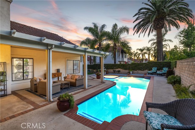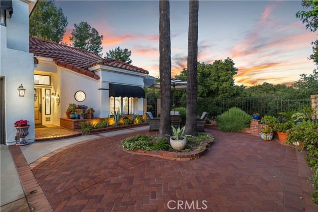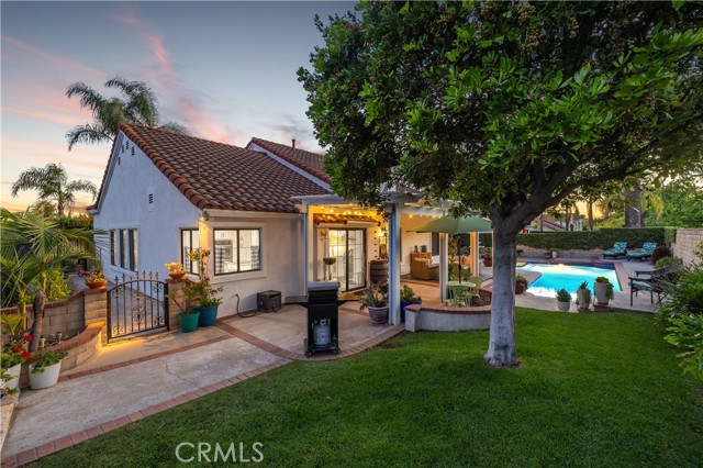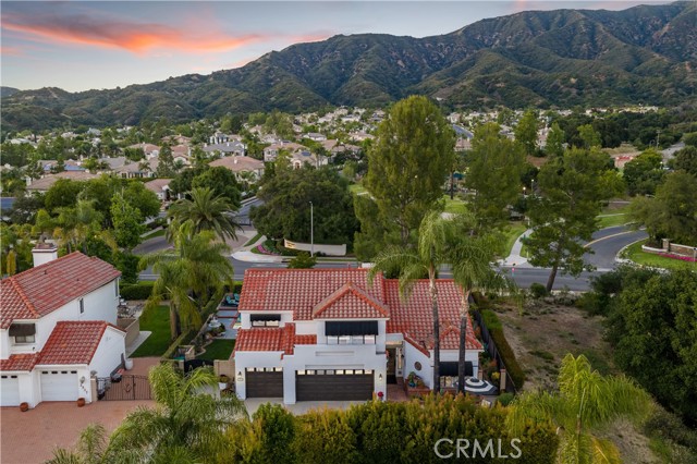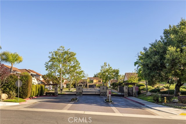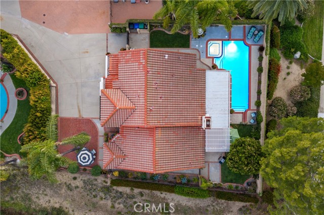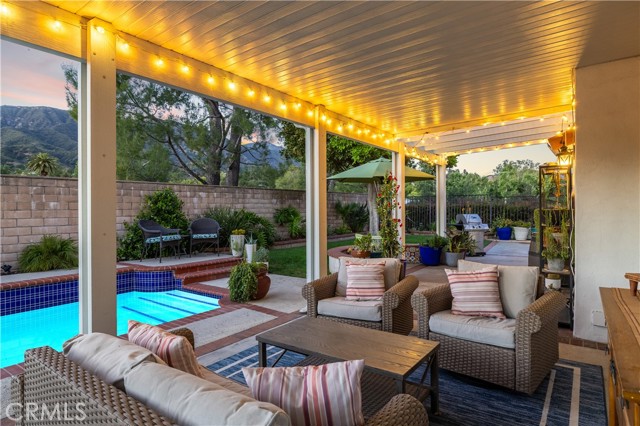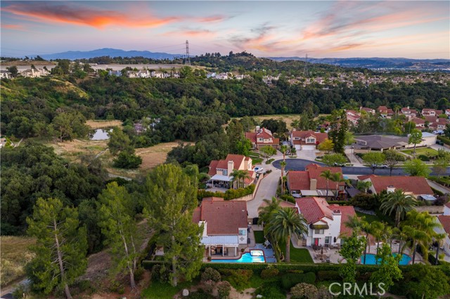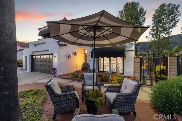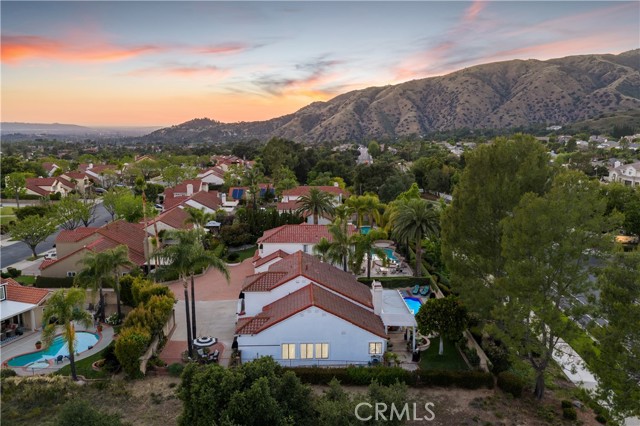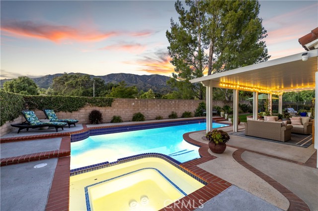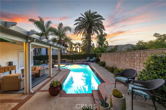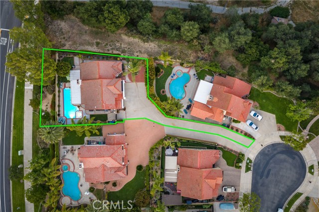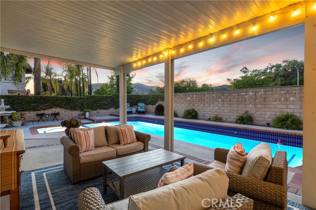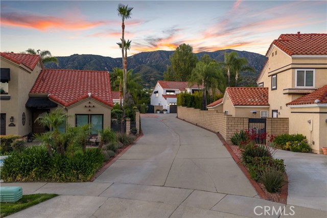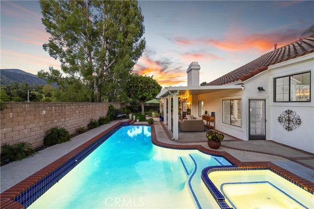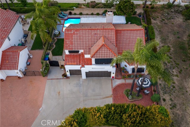Beautifully remodeled pool home in the gated Sierra La Verne community. Situated at the end of a cul-de-sac approached by a private driveway, this residence offers exceptional privacy. The front grounds are highlighted by a brick ribbon driveway, an expansive herringbone brick courtyard, illuminated planters, and a covered entry leading to a beautifully crafted front door. Inside, vaulted ceilings and a chandelier create an inviting first impression, with LVP flooring extending throughout the main living areas. The living room is filled with natural light and flows seamlessly into the formal dining area, defined by a custom banister and railing. The family room opens directly to the kitchen and features vaulted ceilings and a fireplace with custom tile surround and mantel, and sliding glass doors to the backyard. The kitchen features an oversized island with seating and electric cooktop, classic white cabinetry, granite countertops, tiled backsplash, stainless steel appliances, recessed lighting, and a sink capturing outdoor views. The main level also includes a custom-designed powder room with shiplap detailing, a hall closet with a barn door, and a laundry room with direct access to the finished three-car garage. The primary suite is located on the first floor, offering vaulted ceilings, a paneled accent wall, and access to the backyard. The remodeled primary bath presents dual sinks, circular mirrors, a freestanding soaking tub set against a decorative patterned tile wall with subway tile wainscoting, a separate tiled shower with sliding glass enclosure, and a private water closet. Upstairs, three additional bedrooms are complemented by an oversized, fully remodeled bathroom featuring dual sinks, tile flooring, and a custom tiled shower/tub. The backyard is designed as a private retreat, showcasing a newly plastered pool and spa with brick coping, expansive concrete decking, a grass area with a mature tree, an Alumawood-covered patio, and brick-accented planters. Spacious side yards including one with drought-tolerant succulent landscaping. Wrought iron fencing along one side opens to a neighboring greenbelt area, providing added privacy with no direct adjacent home, while mature city-maintained trees beyond the property offer natural shade and a serene backdrop. Mountain views further enhance the setting. Additional upgrades include a new HVAC system, a tankless water heater, and an attic radiant barrier designed to reduce heat and improve efficiency.