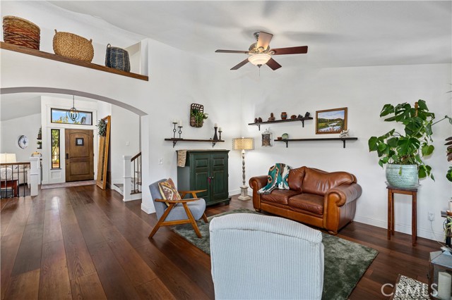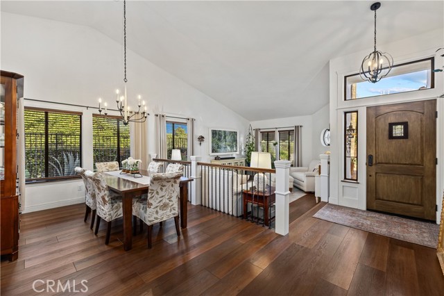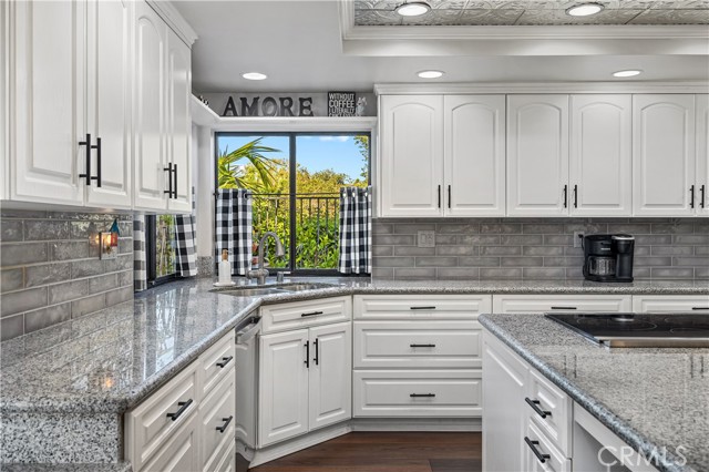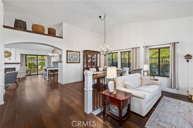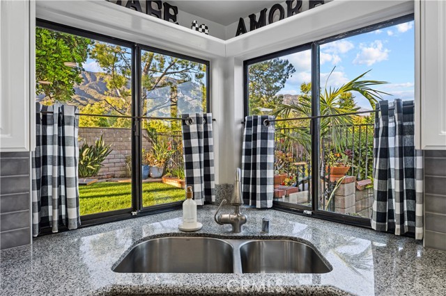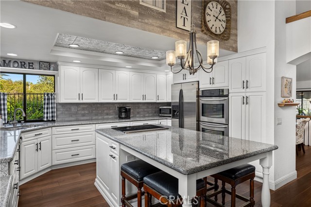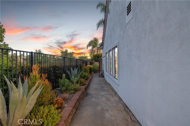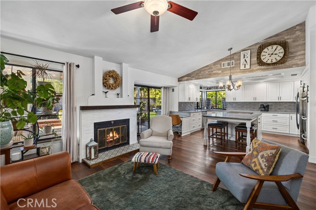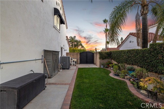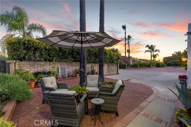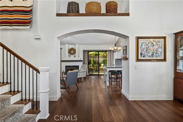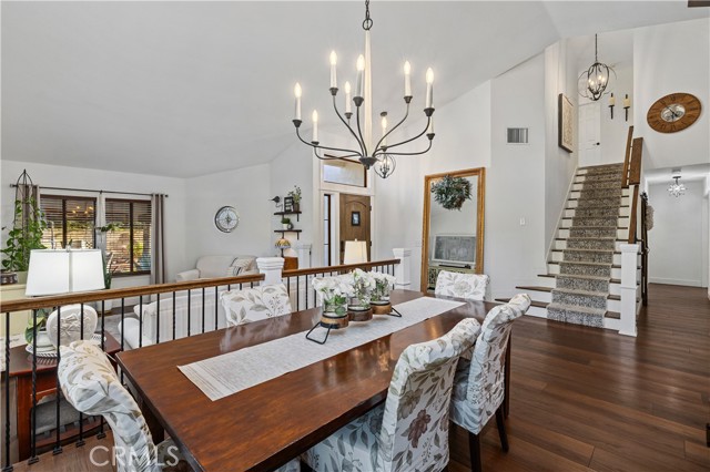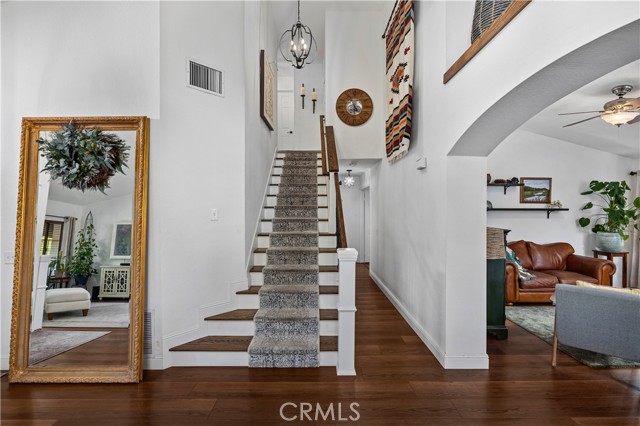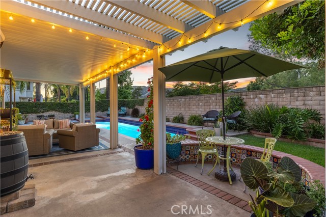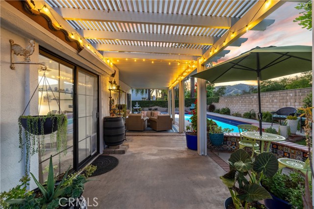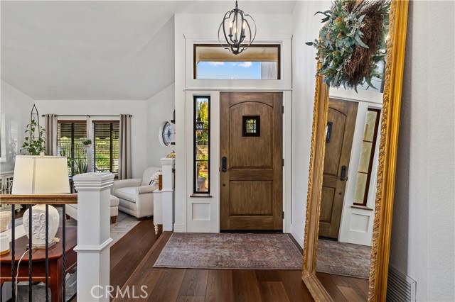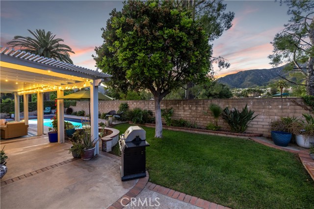 Beautifully remodeled pool home in the gated Sierra La Verne community. Situated at the end of a cul-de-sac approached by a private driveway, this residence offers exceptional privacy. The front grounds are highlighted by a brick ribbon driveway, an expansive herringbone brick courtyard, illuminated planters, and a covered entry leading to a beautifully crafted front door. Inside, vaulted ceilings and a chandelier create an inviting first impression, with LVP flooring extending throughout the main living areas. The living room is filled with natural light and flows seamlessly into the formal dining area, defined by a custom banister and railing. The family room opens directly to the kitchen and features vaulted ceilings and a fireplace with custom tile surround and mantel, and sliding glass doors to the backyard. The kitchen features an oversized island with seating and electric cooktop, classic white cabinetry, granite countertops, tiled backsplash, stainless steel appliances, recessed lighting, and a sink capturing outdoor views. The main level also includes a custom-designed powder room with shiplap detailing, a hall closet with a barn door, and a laundry room with direct access to the finished three-car garage. The primary suite is located on the first floor, offering vaulted ceilings, a paneled accent wall, and access to the backyard. The remodeled primary bath presents dual sinks, circular mirrors, a freestanding soaking tub set against a decorative patterned tile wall with subway tile wainscoting, a separate tiled shower with sliding glass enclosure, and a private water closet. Upstairs, three additional bedrooms are complemented by an oversized, fully remodeled bathroom featuring dual sinks, tile flooring, and a custom tiled shower/tub. The backyard is designed as a private retreat, showcasing a newly plastered pool and spa with brick coping, expansive concrete decking, a grass area with a mature tree, an Alumawood-covered patio, and brick-accented planters. Spacious side yards including one with drought-tolerant succulent landscaping. Wrought iron fencing along one side opens to a neighboring greenbelt area, providing added privacy with no direct adjacent home, while mature city-maintained trees beyond the property offer natural shade and a serene backdrop. Mountain views further enhance the setting. Additional upgrades include a new HVAC system, a tankless water heater, and an attic radiant barrier designed to reduce heat and improve efficiency.