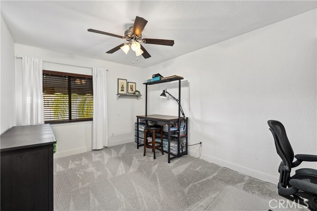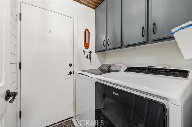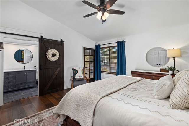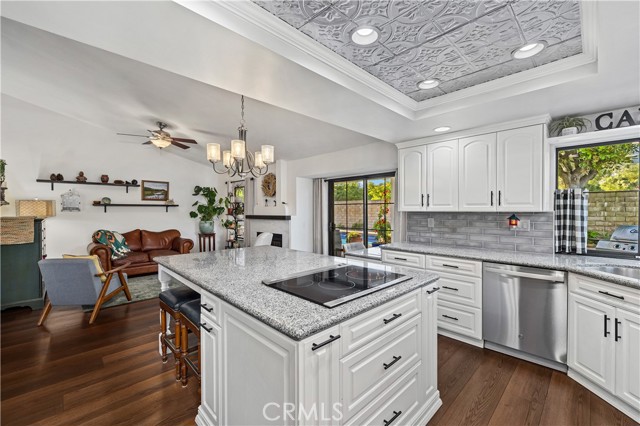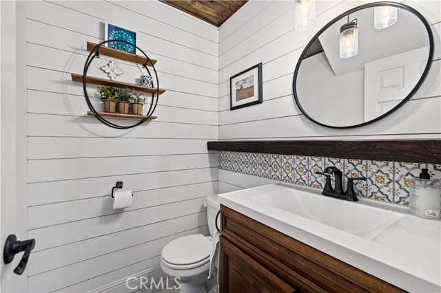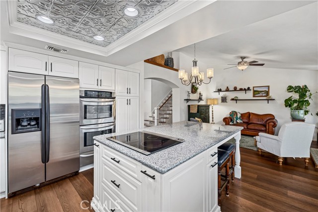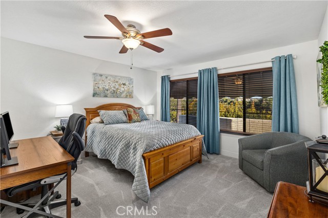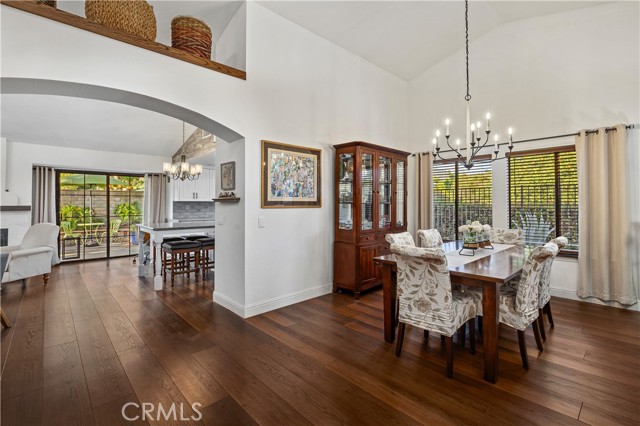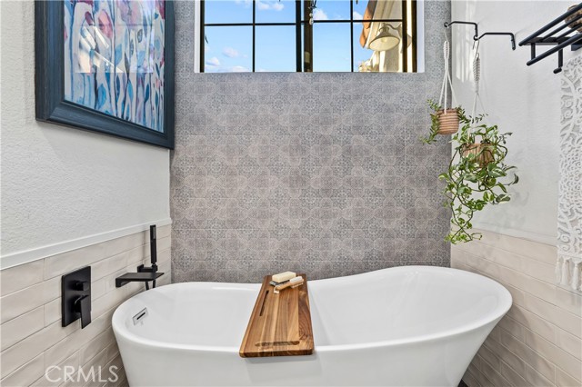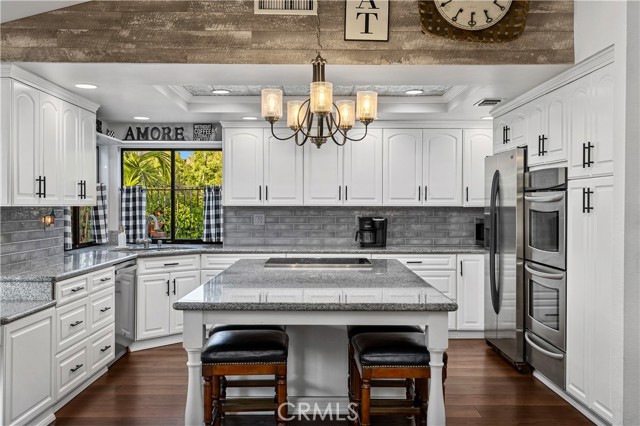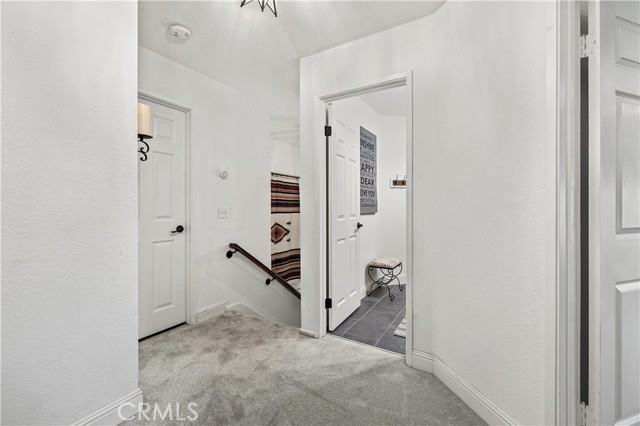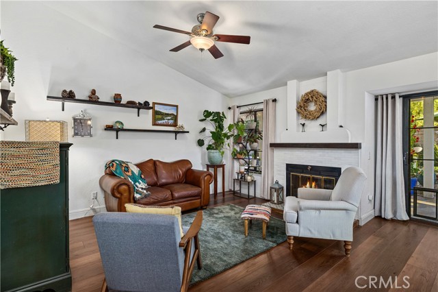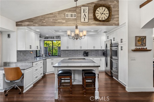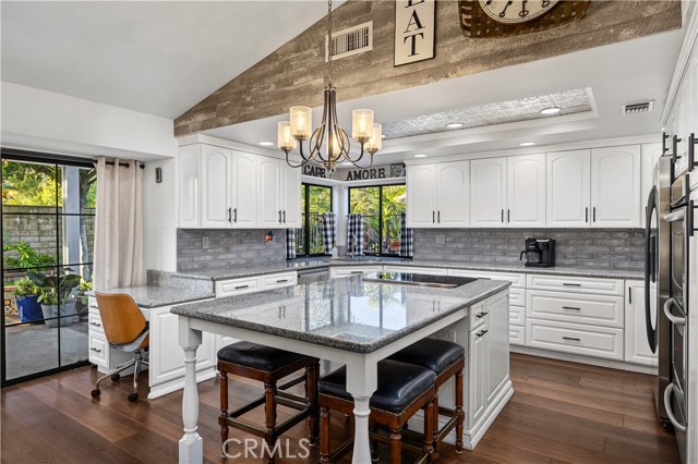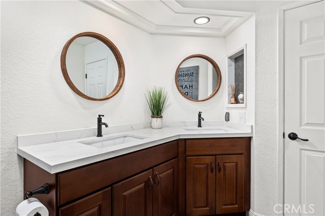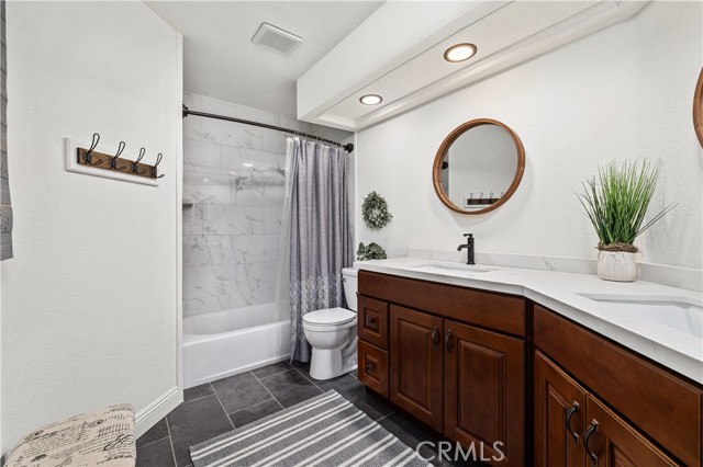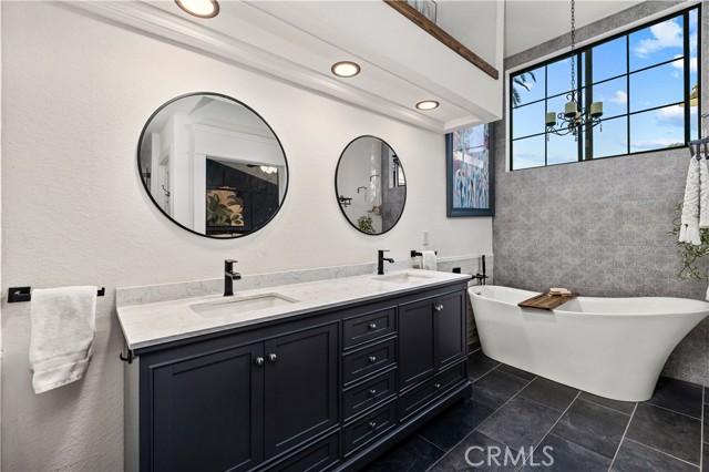 Beautifully remodeled pool home in the gated Sierra La Verne community. Situated at the end of a cul-de-sac approached by a private driveway, this residence offers exceptional privacy. The front grounds are highlighted by a brick ribbon driveway, an expansive herringbone brick courtyard, illuminated planters, and a covered entry leading to a beautifully crafted front door. Inside, vaulted ceilings and a chandelier create an inviting first impression, with LVP flooring extending throughout the main living areas. The living room is filled with natural light and flows seamlessly into the formal dining area, defined by a custom banister and railing. The family room opens directly to the kitchen and features vaulted ceilings and a fireplace with custom tile surround and mantel, and sliding glass doors to the backyard. The kitchen features an oversized island with seating and electric cooktop, classic white cabinetry, granite countertops, tiled backsplash, stainless steel appliances, recessed lighting, and a sink capturing outdoor views. The main level also includes a custom-designed powder room with shiplap detailing, a hall closet with a barn door, and a laundry room with direct access to the finished three-car garage. The primary suite is located on the first floor, offering vaulted ceilings, a paneled accent wall, and access to the backyard. The remodeled primary bath presents dual sinks, circular mirrors, a freestanding soaking tub set against a decorative patterned tile wall with subway tile wainscoting, a separate tiled shower with sliding glass enclosure, and a private water closet. Upstairs, three additional bedrooms are complemented by an oversized, fully remodeled bathroom featuring dual sinks, tile flooring, and a custom tiled shower/tub. The backyard is designed as a private retreat, showcasing a newly plastered pool and spa with brick coping, expansive concrete decking, a grass area with a mature tree, an Alumawood-covered patio, and brick-accented planters. Spacious side yards including one with drought-tolerant succulent landscaping. Wrought iron fencing along one side opens to a neighboring greenbelt area, providing added privacy with no direct adjacent home, while mature city-maintained trees beyond the property offer natural shade and a serene backdrop. Mountain views further enhance the setting. Additional upgrades include a new HVAC system, a tankless water heater, and an attic radiant barrier designed to reduce heat and improve efficiency.