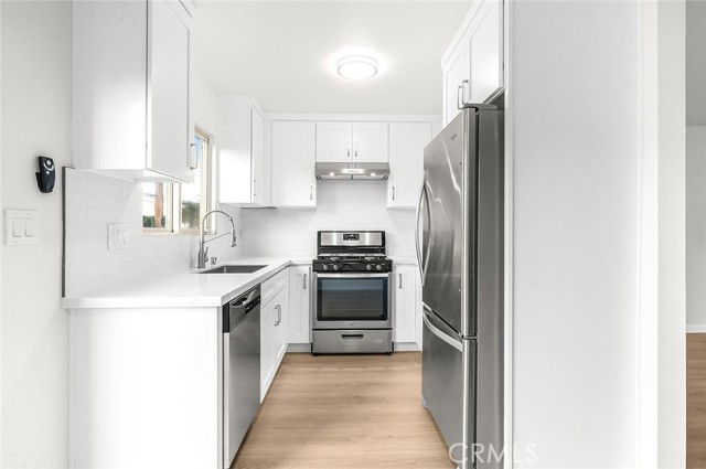 If you’ve been waiting for the right moment to step into your first home, this is the one that finally makes it feel possible. This fully updated single-story home offers a clean, move-in ready interior with modern finishes throughout and a layout that just makes sense for everyday living. The spacious living area opens up with new luxury vinyl plank flooring, abundant natural light, and an easy flow that connects seamlessly to the dining and kitchen spaces, making it feel larger and more inviting than you’d expect. The kitchen has been thoughtfully upgraded with quartz countertops, crisp white cabinetry, and stainless steel appliances, creating a bright and functional space you’ll actually enjoy using. Bedrooms are well-sized with good closet space, while both bathrooms have been updated with quartz countertops, modern finishes, a stylish double vanity, and a clean, contemporary shower design that adds a touch of everyday comfort. Step outside and you’ll find a private backyard with room to relax, entertain, or create your own outdoor space, something many buyers in this price range have been searching for. Additional highlights include a two-car garage, wide driveway, and convenient indoor-outdoor access. Located in a quiet residential neighborhood near schools, shopping, and major freeways, this home offers both comfort and convenience. More than anything, this is the kind of home that allows you to stop renting, start building your future, and truly feel settled, and homes with this level of updates and move-in ready condition don’t come up often, so if you’ve been waiting for the right one, this is your opportunity.