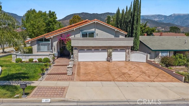 Set north of the 210 freeway, in one of North Upland's most coveted pockets, this refined residence lives up to the setting, elevated, light-filled, & truly move-in ready. The stacked-stone entry, tile roof, & stamped concrete drive signal what lies inside: a home that looks more like a custom build than a tract floor plan. Step through the door into a formal living room anchored by soaring vaulted ceilings, an arched window wall, & a chandelier drawing the eye upward. Natural light pours in from every angle. Warm hardwood floors carry through the main level, setting an understated elegance from room to room. The heart of the home is the remodeled chef's kitchen. A granite island with hand-carved corbels centers the space, flanked by crisp white cabinetry, a stainless pro-style range, & a designer vent hood. Skylights, pendant lighting, & a stacked-stone fireplace with its own hearth give the kitchen the feel of a true gathering room. Three picture windows frame the backyard greenery from the sink. A formal sitting area with a second stone fireplace & shiplap surround offers a quiet retreat, ideal for morning coffee or a glass of wine at day's end. A main-level bedroom & full bath sit off the living areas, offering rare flexibility for guests, multigenerational living, or a private home office. Upstairs, the primary suite delivers on scale & comfort, with vaulted ceilings, a barn-door entry, a walk-in closet, and a spa-inspired bath featuring a soaking tub, separate shower, & warm wood ceiling detail. Generously sized secondary bedrooms & an updated hall bath round out the upper level. The laundry room was thoughtfully relocated upstairs for everyday convenience. Outside, the backyard opens onto a lush lawn, flowering rose bushes, a built-in BBQ, a stamped concrete patio, and a potting shed for the gardener. Bistro lights and lamp-post lighting extend the space for long evening gatherings. A three-car garage & extended driveway add practical value that many nearby homes lack. You are minutes from Colonies Crossroads, historic Downtown Upland, & the Claremont Village for dining & boutique shopping. The 210 & 10 freeways offer straightforward access to Pasadena, downtown LA, & the Inland Empire, with Ontario International Airport a short drive away. Highly regarded schools, parks, & hiking trails in the San Gabriel foothills sit at your back door, with Mt. Baldy framing your daily view. This one stands apart. Schedule your private tour before it slips away.