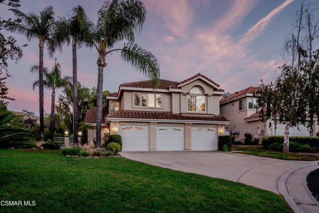 Located at the end of a quiet cul-de-sac in the sought-after High Meadows neighborhood of Wood Ranch, this spacious 5-bedroom, 3-bathroom home offers 3,153 sq ft of living space on an 8,200 sq ft lot with lush landscaping and mountain views. All major systems replaced within the last 5 years! The well-designed floor-plan includes a downstairs bedroom and full bath, ideal for guests or multi-generational living. Upon entry, you're welcomed by soaring ceilings and an abundance of natural light from numerous windows. The neutral interior features a formal living and dining room, and a separate family room with a fireplace. The kitchen is equipped with a newer stove, refrigerator, and dishwasher, tile countertops, light wood cabinetry, and a breakfast nook that opens to the family room. A separate laundry room is located on the first floor. Upstairs includes three generously sized guest bedrooms and a full guest bath with dual sinks and a shower/tub combo. The large primary suite features vaulted ceilings, a sitting area with a fireplace, and expansive views of the surrounding trees and mountains. The en-suite bath includes a walk-in shower, sunken tub, dual vanities, ample storage, and a walk-in closet. The private backyard offers a patio area, built-in BBQ, and storage shed--ideal for outdoor entertaining. The oversized 3-car garage includes built-in storage, with a portion converted into a functional office space. Additional features include plantation shutters throughout most of the home, a newer AC system, water heater, and updated downstairs bath with porcelain tile flooring. Enjoy access to nearby hiking and biking trails, parks, and the Wood Ranch Country Club. Conveniently located near shops, dining, the 23 freeway, and the Ronald Reagan Library. Homes on this street rarely come to market--don't miss this opportunity.