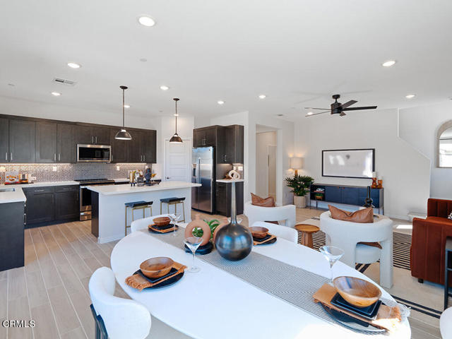 Welcome to this beautifully reimagined single-story home, where modern design meets everyday comfort in one of Simi Valley's most desirable neighborhoods. Thoughtfully remodeled throughout, this residence offers a seamless blend of style, functionality, and indoor-outdoor living.Inside, the home features three bedrooms (possible fourth), a welcoming family room with fireplace and custom built-ins, new wide-plank flooring, abundant natural light, and an open-concept layout ideal for both daily living and entertaining. The stunning chef's kitchen serves as the heart of the home, showcasing custom white cabinetry, new quartz countertops, stainless steel appliances, a large center island, and a full-height backsplash with under-cabinet lighting--perfect for gathering and hosting.Retreat to the beautifully upgraded primary suite, complete with a spa-inspired bathroom featuring a walk-in glass shower, modern tilework, dual vanities, a walk-in closet, and a freestanding soaking tub--creating a true luxury experience at home.A standout feature is the dedicated media/flex room, ideal for movie nights, a home office, gym, or additional living space, offering the versatility today's buyers are seeking.Step outside to a private backyard designed for relaxation and entertaining. Enjoy a covered patio for dining, an expansive seating area, and a custom fire pit set against a peaceful, landscaped backdrop. The yard offers a rare combination of usable space, fruit trees, privacy, views, and scenic surroundings--perfect for indoor-outdoor California living.Additional highlights include remodeled secondary bathrooms, recessed lighting throughout, plantation shutters, custom storage, and an upgraded spacious three-car garage.This turnkey home delivers the perfect blend of luxury, lifestyle, and location